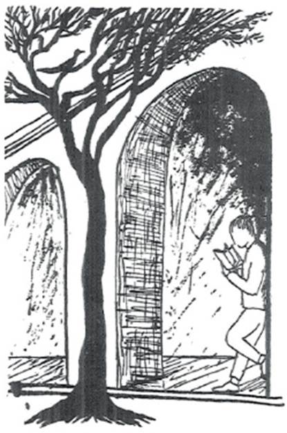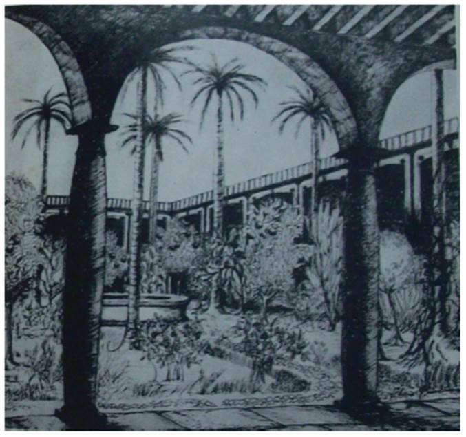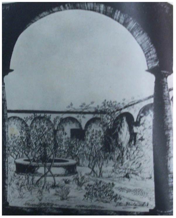 2.-“Lámina IV. Patio de los Jazmines (Facultad de Letras) (Dibujo a Tinta China de AB)” (Valcárcel, 1951, p. 30). Bustamante Vernal plasmó una parte de la arquitectura de un corredor cuadrangular, conformado por columnas que sostienen arcos de medio punto las cuales remataban en un techo recto, además el jardín está rodeado por árboles de naranjos y algunas palmeras.