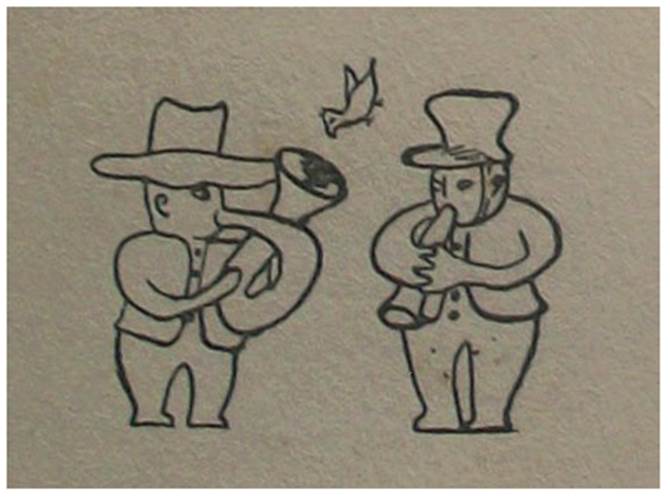 También la flora está presente por medio de una planta andina que por la forma de sus hojas e inflorescencias laxas corresponde a la quinua, familia Chenopodiaceae y género Chenopodium quinoa. De la misma manera, en las cuatro viñetas contenidas en el interior del libro también se alude a la naturaleza, al igual que en las canciones. La flora está representada por el maguey (Furcraea andina), especie silvestre de la región quechua, que es una planta fácil de reconocer en el paisaje andino. La fauna acuática está presente por medio de los peces que viven en los ríos de la sierra. El diseño se relaciona con el tema de la canción, pues la vida de los peces en el agua cristalina cambia definitivamente cuando llega el “repunte” con agua turbia. A su vez, las aves hacen referencia a las relaciones sentimentales de los enamorados. Primero un ave sobre una rama se prepara para la construcción de un nido e invita al “patito” de la canción para realizar tal tarea (Arguedas, 1938, p. 41), entonces significaría la unión de una pareja. Según Alejandro Ortiz 3 (1997), cuando un “pato” llora “hiere el corazón del amante solitario” (p. 363). Luego dos aves están separadas en una rama horizontal ondulada, lo que señala el fin de la relación entre un par de enamorados, porque en la canción el hombre regresa solo a su pueblo (Arguedas, 1938, p. 51).
