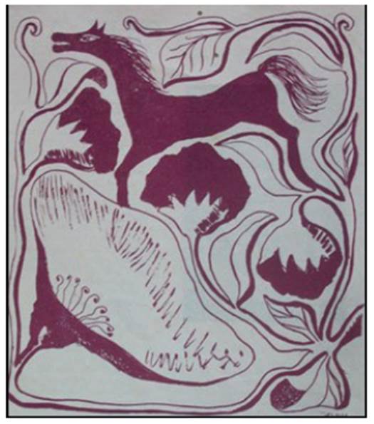 En la ilustración, Bustamante Vernal plasmó una vez más la naturaleza: la flora representada por la planta medicinal Culcitium canescens y la fauna por el caballo.