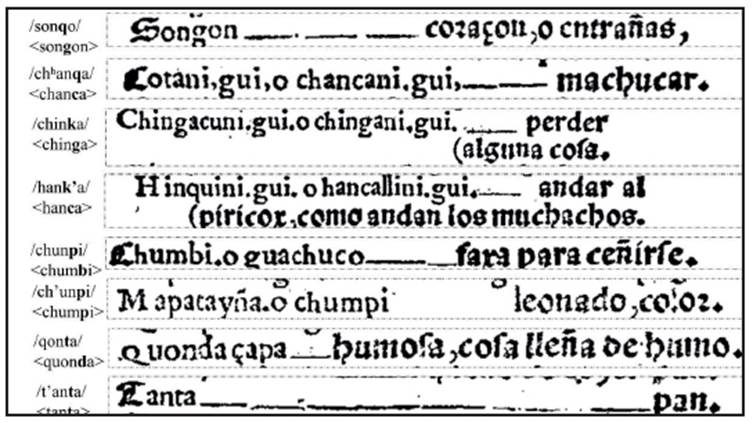 Pues no solo en la cortesana del Cuzco, a Buenos Ayres, sino en la inculta de por aca, sus vocablos, que son vnos en todo Perú, desde Quito a Buenos Ayres, tienen la misma variación por la pronunciación. Pues en todo el Reyno, distinguen con ella a Tuta. Por la Noche. Y Thutta. Por la Polilla. A Ccacca. Por la Peña, o Caca. Por el Tio. O Kcaça. El entonado. Y assi en todos los Vnisonos. (1648)