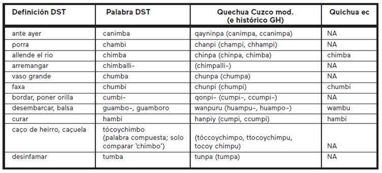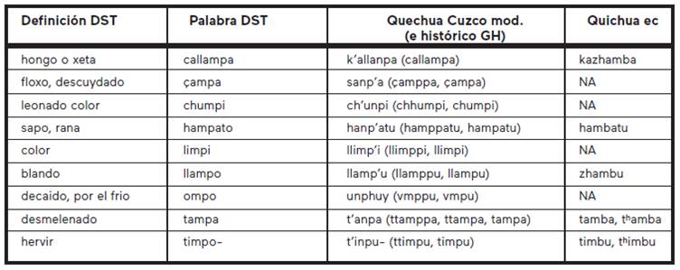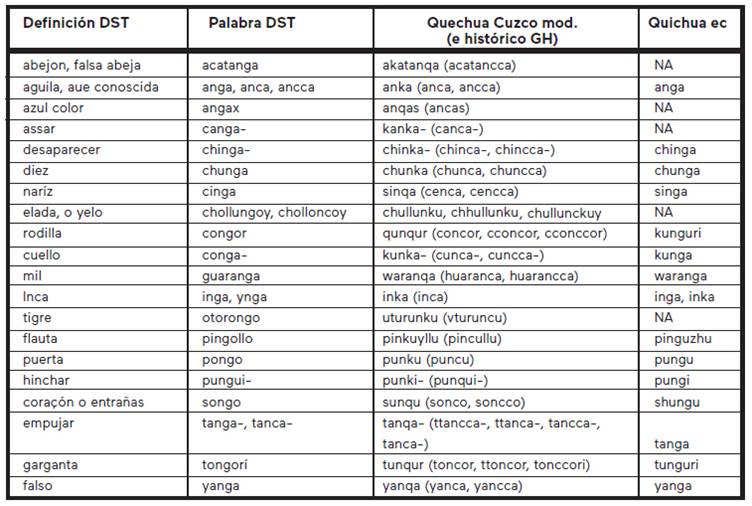 Empezando con las palabras escritas con <g> después de /n/ en DST, encontramos que la mayoría de sus cognados en quechua cuzqueño tenían oclusivas simples (19/21)3. El quichua ecuatoriano también sonoriza oclusivas en todos los casos donde se pudo encontrar cognados, aunque hay muchas menos correspondencias léxicas en general que cuando comparamos el quechua de DST y el cuzqueño Tabla 1.