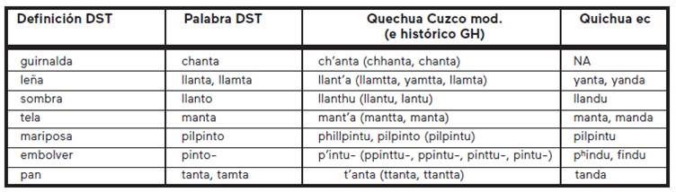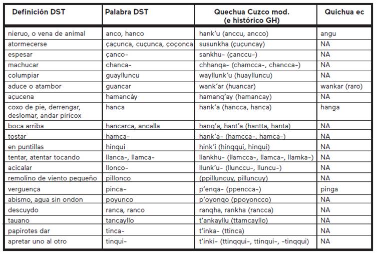 Tabla 6 Palabras con la secuencia <nt> en el quechua de DST y oclusivas complejas en el quechua cuzqueño (n = 7).