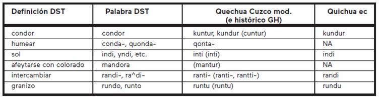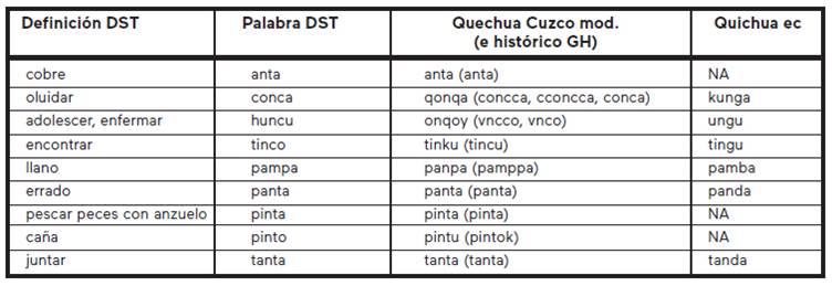 Tabla 5 Palabras con la secuencia <nd> en el quechua de DST y oclusivas simples en el quechua cuzqueño (n = 6)7.
