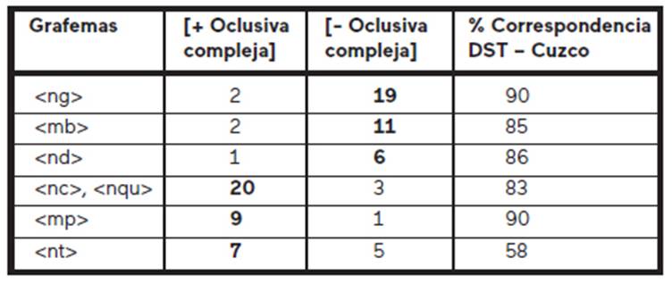 Tabla 4 Palabras con la secuencia <mp> en el quechua de DST y oclusivas complejas en el quechua cuzqueño (n = 9)
