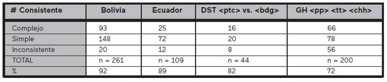 Tabla 10 Comparación de tazas de consistencia de correspondencia de contraste sencillo-complejo del quechua cuzqueño (Cusihuamán, 1979; Gobierno Regional Cusco, 2005) con el quechua boliviano (Laime Ajacopa, et ál., 1997), el quichua ecuatoriano serrano (datos primarios, dialecto Cotopaxi), DST (indicado por sonorización) y GH (indicado por duplicación consistente de letras, o variación entre una y dos letras), con base en una lista estandarizada.