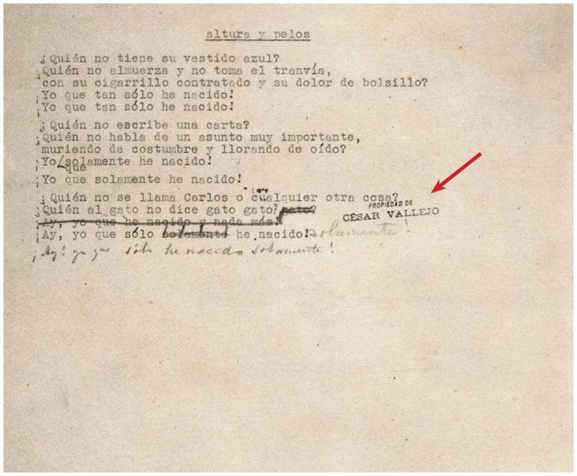 Los modelos de edición sobre la poesía de Vallejo pueden sintetizarse en cuatro. El primero es el que prepara Georgette de Vallejo y que publica bajo el título Obra poética completa (Vallejo, 1968). El modelo de edición que la organiza habilita un apartado para el prólogo de Américo Ferrari y otro para el colofón de Georgette de Vallejo; la distribución de la obra poética sigue el orden cronológico, y para el caso de la poesía póstuma, la edición ofrece los facsimilares de los manuscritos mecanografiados y corregidos a mano por Vallejo. La imagen de estos escritos revela el sistema de lectura y reescritura que Vallejo seguía hasta llegar a la versión final de sus textos. De hecho, la edición de Georgette será la primera en acompañar la poesía con los facsimilares manuscritos del poeta. Llama la atención la constante aparición, por algunas de las carillas facsimilares, del sello “Propiedad de César Vallejo” (Imagen 1). Veamos este peculiar grabado: