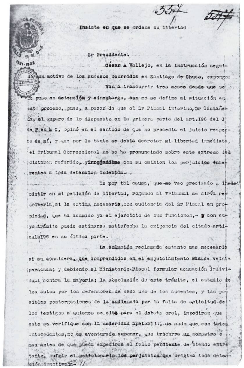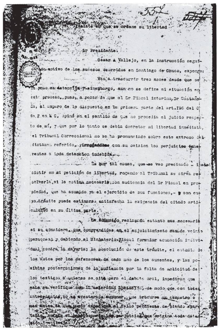 El juicio que sigo ha venido a la Suprema en apelación. Espero que este alto cuerpo de justicia anulará toda esa instrucción ilegal declarándome completamente ajeno a todos esos salvajismos perpetrados en Santiago de Chuco, graves o leves. El Tribunal de Trujillo, al suponerme partícipe de estos últimos, pretende justificarse ante el público por haberme mantenido tanto tiempo arbitrariamente encarcelado, y al mismo tiempo corroborar lo cometido por su juez: una escaramuza muy jurídica y muy criolla. (Vallejo, 1921, p. 2; cfr. también Vallejo, 1984)