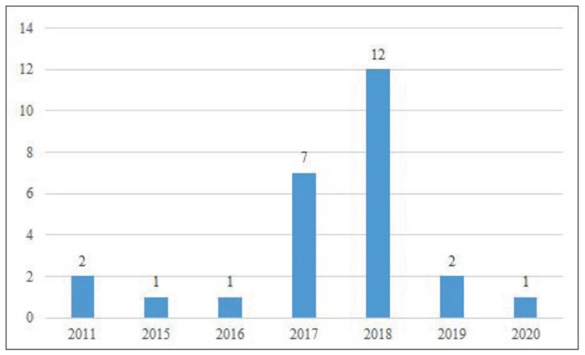 Regarding the year of publication, empirical articles conducted between the years 2010 and 2020 were considered in the initial stage of this literature review. However, the first research reporting translingual practices in second language writing at tertiary level was published in 2011. A total of 26 papers were identified within this period, outnumbering years 2017 and 2018, with seven (27%) and twelve (46%) published articles respectively. Figure 1 illustrates the number of articles in each year of publication.