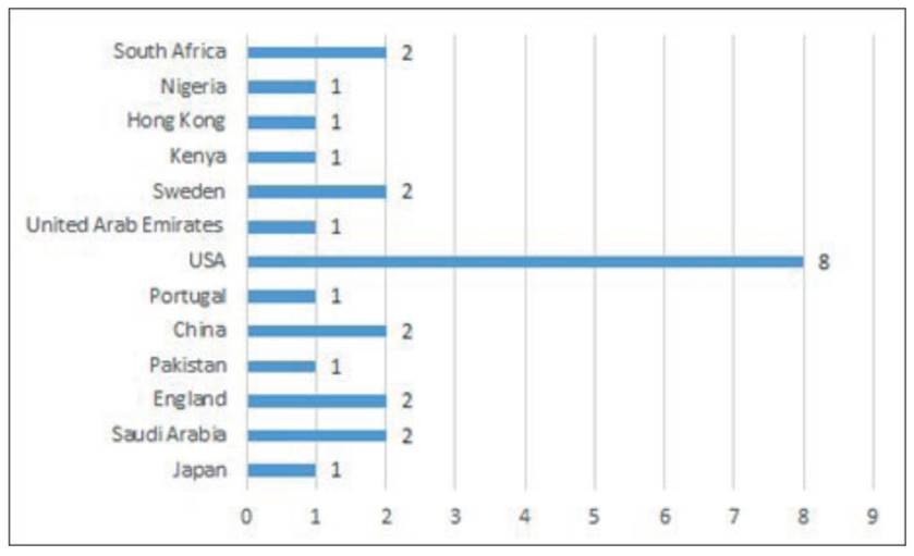 Referring to the geographical distribution of these research articles, two variables were considered: the country where the research was conducted and the country of the publishing journal. Regarding the former, a democratic geographic distribution is observed worldwide. Eight articles (32%) report research conducted in Asia, eight (32%) in America, five (20%) in Europe and four (16%) in African countries. Besides the US, South Africa, Sweden, China, England and Saudi Arabia outline with two articles each. Figure 2 organizes the geographical distribution in terms of the country where the research was conducted.