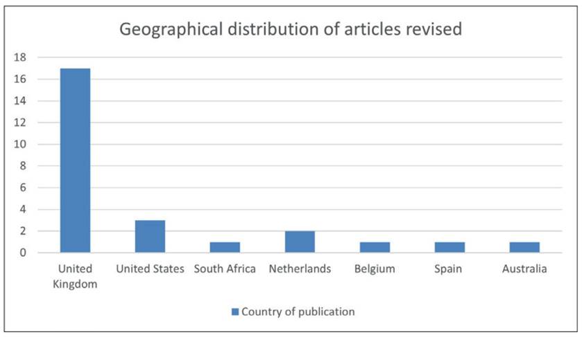 On the other hand, British indexed journals concentrate two-thirds of the research articles (65%). US journals published 12% of these papers (N=3), followed by the Netherlands with 8% (N=2). Belgian, South-African, Spanish and Australian journals had each 4% of the articles each (N=1). Figure 3 depicts the geographical distribution in terms of the country of publication, whereas the journals where these research articles were published are described in Table 3.