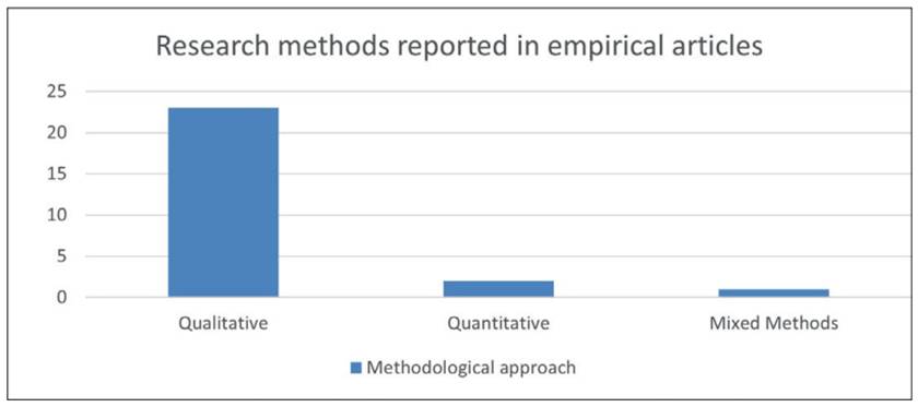 Regarding research methods involved in each of the articles part of this revision, 88% (N=23) informed qualitative procedures in their methodological sections, whereas two articles (8%) were conducted under quantitative methods. Only one paper (4%) reported mixed-methods research, combining both qualitative and quantitative approaches. Figure 4 provides an overview of the research methods considered in this literature review.