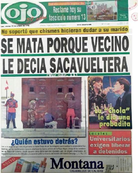 Es sobre este punto que se observa una diferencia importante en el curso de la década examinada. Al final de dicho período se había consolidado, en todos los diarios, un género discursivo particular: la columna de chismes. De esa manera, para 1998, todos presentan al menos dos secciones como esta en las grandes unidades tópicas señaladas: una de chismes del espectáculo y otra de chismes del deporte. En esta encontramos una estrategia enunciativa similar que explicita, por embrague actorial, un yo-enunciador: el del chismoso o chismosa, quien a su vez por las formas aspectuales que emplea para presentar aquello que refiere caracteriza su figura actorial con los rasgos de su desenvoltura y vivacidad. Para el final del período examinado, encontramos en Ojo "El show de Las Malas lenguas" de notas breves del espectáculo y "El Ojón" de Casimiro V. de chismes del deporte. En tanto, en Ajá, se observan "TeVi Choche" de Lupe Miranda de chismes del espectáculo y "La Pichanguita" de El Lobo de chismes del deporte. Estas columnas no pueden ser confundidas con columnas de opinión por la sola presencia de un yo-enunciador explícito; las columnas de chismes que señalamos se caracterizan, además, de modo determinante, por la fragmentación de la información referida (no se habla de uno, sino de múltiples acontecimientos), así como por la aspectualización que tiende a la derrisión: los actores señalados son sujeto de burla o comentario mordaz.