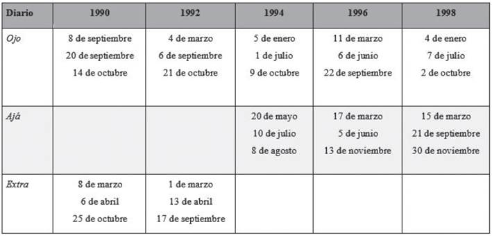 El corpus con el que hemos trabajado ha sido constituido buscando representar el cambio que se produjo en la década señalada. Basados en la información que pudimos obtener sobre los índices de lectoría, recogidos en Mendoza Michilot (2013, pp. 267-276), Gargurevich (1999, pp. 256-262) y Fowks (2015, p. 71), pudimos establecer que los diarios populares más leídos en dicho período fueron: Ojo (1990-2000), Ajá (1994-2000) y Extra (1990-1992). Hemos buscado centrarnos en observar los cambios que se produjeron en el tiempo, pues lo que nos interesa es ver los cambios y la consolidación de las estrategias discursivas y de los géneros presentes en los diarios en el devenir. Así, no hemos seguido ningún criterio temático para seleccionar los diarios, solo hemos buscado que pertenezcan a tres meses distintos del año observado. Para evitar la superposición de intereses coyunturales, más ligados al interés de una estrategia de comunicación política específica, hemos evitado integrar los últimos años de esa década, cuando las relaciones de subordinación y clientelismo ligadas a la campaña de segunda reelección de Fujimori fueron mucho más evidentes. Para el período 1990-1998 hemos seleccionado los dos diarios de prensa popular más leídos cada dos años (1990, 1992, 1994, 1996 y 1998); luego, escogimos tres números por diario de los dos periódicos más leídos cada uno de estos años (Tabla 1). Nuestro corpus ha estado entonces constituido de 30 ejemplares de diarios populares a partir de los criterios señalados.