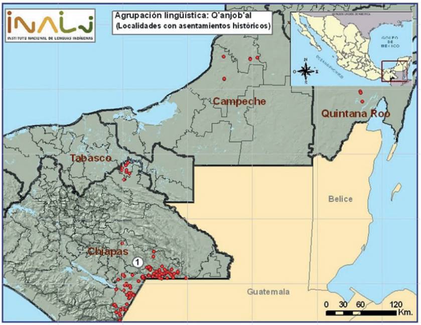 Debido a los procesos de naturalización, la lengua k’anjob’al se habla en los estados de Campeche, Quintana Roo y Chiapas. El Instituto Nacional de Estadística y Geografía (INEGI, 2020) contabilizó 10.951 hablantes de esta lengua, de los cuales 1639 habitan en el estado de Campeche. Asimismo, de acuerdo con el INEGI (2015) en Quintana Roo se registraron alrededor de 1400 hablantes del k’anjob’al. Por lo tanto, es en el estado de Chiapas en el que habita la mayor población k’anjob’al, más precisamente en la región fronteriza del estado de Chiapas (véase Mapa 1). Es importante mencionar que, aunque en este estado es en el que se encuentran la mayoría de comunidades k’anjob’ales, estas se hallan dispersas y en algunos casos viajar de una comunidad a otra puede ser un recorrido de varios kilómetros. Por tal motivo, muchas de las iniciativas que se generan se concentran en algunas comunidades y, pocas veces, pueden incidir o conocerse en otras de ellas, pues la dispersión dificulta la comunicación entre sí. Esto sin contar la poca o nula interacción con las comunidades de los estados de Campeche y Quintana Roo.