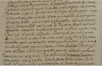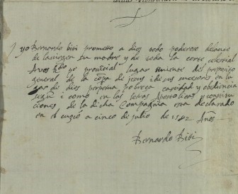 (yo Bernardo bitti prometto a dios todo poderoso delante de la virgen su madre y de toda la corte celestial A vos R[everen]do p[adr]e Provincial lugar teniente del proposito general de la co[m] pa[ñía] de jesus i de sus sucesores en lugar de dios perpetua pobreza castidad y obediencia segun i como en las letras Apostólicas y constituciones de la dicha Compagnia esta declarado en el cuzco a cinco de julio de 1582 Años / Bernardo Bitti [destacado mío])