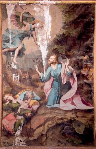 En el año 2010 se dio a conocer públicamente el hallazgo de la única serie de 8 lienzos, que se conserva íntegra, sobre Los principales Misterios de la vida y muerte de Cristo nuestro Salvador y de la Virgen Santísima su madre, realizada por Bernardo Bitti, para la iglesia del colegio jesuita de la Transfiguración en la ciudad de Cuzco a fines del siglo XVI y que actualmente se encuentra ubicada en la iglesia Santo Tomás de Aquino en el distrito de Rondocan, provincia de Acomayo en Cuzco. La Oración en el huerto es uno de los ocho cuadros con mayor tensión en la serie, donde la impasibilidad de los apóstoles que se han quedado dormidos y que aparecen descansando a un lado contrasta con la soledad en que se muestra a Cristo ante el ángel que le ofrece el cáliz. Lo oscuro del paisaje, como corresponde a la escena representada, se ve iluminado por el ángel con el cáliz de la Pasión, indicando que el camino de la luz pasa por la aceptación de dicho cáliz. Descripción narrativa y propósito simbólico coinciden perfectamente en la composición de la obra.