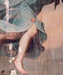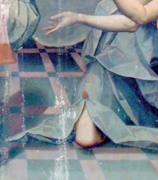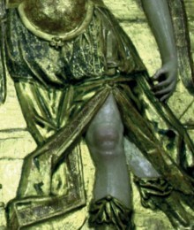 El encanto del ángel se revela entonces en la elegancia de su atuendo que exhibe parte de su anatomía, como brazos y piernas. Un delicado broche dorado aúna el vestido y destaca el escote de la pierna derecha (Figura 5). Este detalle del broche se repite también en la vestidura de unos de los ángeles en la Imposición de la casulla a san Ildefonso (Figura 6) pintada por Bitti, actualmente en el Museo de la Catedral de Sucre. La particularidad de este elemento es otra marca en las obras del hermano jesuita, ya que se puede encontrar en diversos cuadros: el broche que remata el escote del cuello de san José en la Adoración de los Reyes Magos y, en el mismo lienzo, en las vestimentas de la comitiva de los Reyes; también lo encontramos en la Coronación de Cuzco, en la manga de uno de los ángeles músicos; además, en la manga de la túnica de María en la Virgen con el Niño de Arequipa; y hasta en las sandalias de Cristo en la Transfiguración, en esta misma serie. Este particular detalle no pasa desapercibido también en la escultura; así se puede apreciar en el atuendo que portan dos de los ángeles en el relieve de Challapampa10 (Figura 7). Uno de ellos lleva puesto el broche a la altura del muslo, separando los pliegues de su vestimenta y dejando ver casi íntegra la pierna.