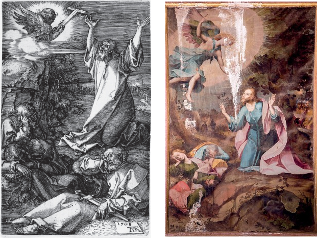 Para esta composición no se puede descartar la posibilidad de que Bitti haya conocido la obra de Albert Durero (Núremberg, 1471-1528) ya que es sabido que el pintor alemán, después de haber estado por segunda vez en Italia, entre 1505-1507, elaboró tres series de la pasión de Cristo. La primera, La gran pasión, publicada en Núremberg en 1511, compuesta de doce xilografías que fueron impresas por separado entre 1496 y 1511. La pequeña pasión en madera fue publicada en 1511, integrada por 38 xilografías realizadas entre 1509 y 1511 y La pequeña pasión en cobre, formada de 16 grabados al buril, la mayor parte elaborados entre 1512 y 1513. La Oración en el huerto es el número dos del ciclo de dieciséis grabados. En la obra de Durero se aprecia a Jesús con los brazos alzados, mientras un ángel sostiene una cruz de tau y emana unos rayos luminosos con su presencia (Figura 8).
