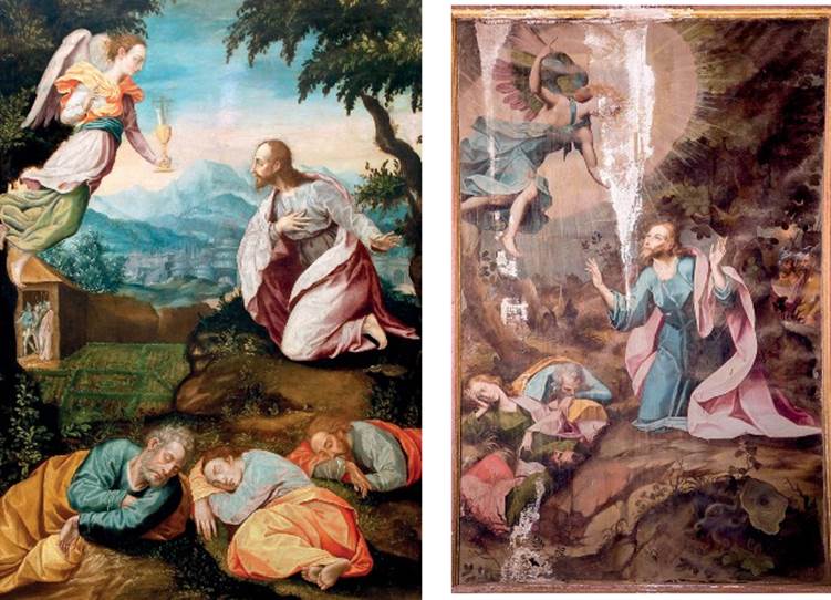 Figura 10 Comparación de cuadro atribuido a Bernardo Bitti, Oración en el huerto, óleo sobre tela, 133,1 x 103 cm, ca. 1596-1598, Museo Nacional de Arqueología, Antropología e Historia del Perú, Lima (izquierda) con el de Bernardo Bitti, Oración en el huerto, óleo sobre lienzo, 343 x 227 cm, 1596-1598, iglesia Santo Tomás de Aquino de Rondocan, Acomayo, Cuzco (Arzobispado de Cuzco) (derecha).