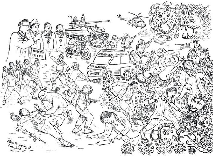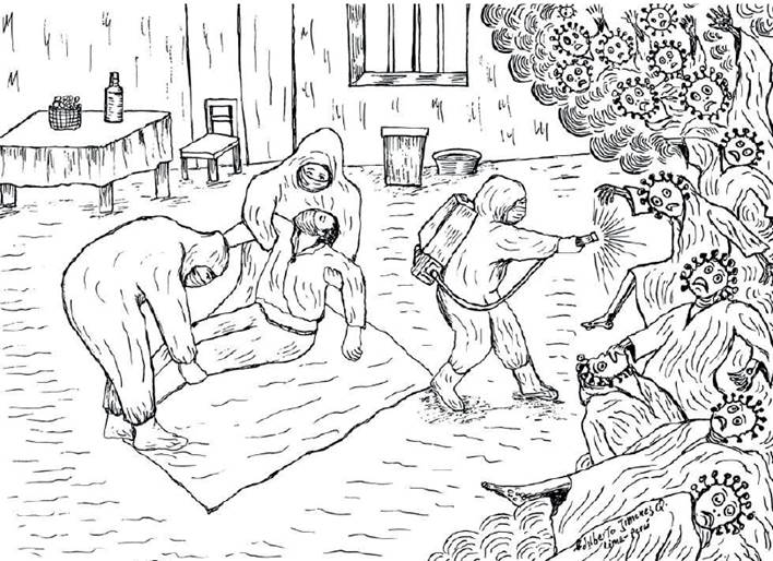 Edilberto Jiménez en sus memorias de la pandemia consigue darle forma a ese "enemigo invisible" que desde inicios de marzo de 2020 comenzó a propagarse también en el territorio peruano: el virus de la COVID-19. A pesar de no tratarse de una historieta, las imágenes recopiladas en el libro de Jiménez parecen ajustarse a la categoría de la "patografía gráfica", creada por Michael J. Green y Kimberly R. Myers para referirse a las autobiografías en forma de cómic sobre enfermedad (González Cabeza, 2018, p. 295; Williams, 2015, p. 115). En efecto, al tomar como punto de partida la importancia que las representaciones iconográficas de la salud y la enfermedad tienen en la sociedad (Gilman, 1988), y de forma parecida a lo que hacen las obras de narrativas de medicina gráfica, las ilustraciones de Jiménez contribuyen a crear un imaginario de la enfermedad que puede influenciar la forma en que otros la perciben, así como la experiencia de los pacientes que la sufren; ello favorece, además, la formación de un discurso vigente acerca de la salud dentro y fuera del ámbito clínico (González Cabeza, 2018, p. 296), desestructurando estereotipos y denunciando injusticias sociales.