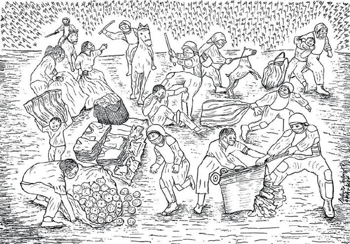 El segundo dibujo y testimonio relevante para mostrar el reverso de la exclusión del Estado es el titulado "Para salvar el hambre" (Jiménez, 2021, pp. 196-197). Citamos el testimonio de Jiménez: