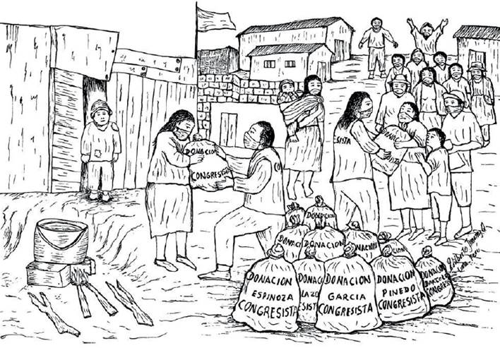 El segundo tipo de violencia que conceptualiza Žižek, y que identificamos en el libro, es la objetiva. Esta se entiende como una estructural, sistémica, como aquella que funciona sutil y naturalizadamente. En realidad, esta es la que más abunda en las crónicas de Edilberto Jiménez. Un ejemplo lo encontramos en el dibujo titulado "Políticos hacen aprovechamiento de la pandemia" (Jiménez, 2021, pp. 66-67) en el que aparecen algunos congresistas oportunistas entregando donaciones para los más vulnerables (Figura 4). Esta acción no solo es ilegal, sino que visibiliza que dichos políticos no tienen un interés legítimo en generar una sociedad con acceso igualitario a los bienes y servicios, sino que esperan mantener la cultura de la dominación y dependencia. Aquella en la que un derecho legítimo se ve reemplazado por una "ayuda".