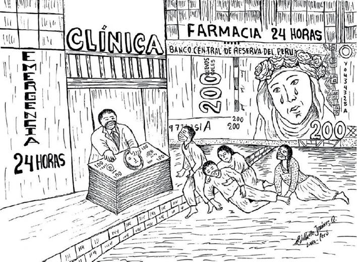 El dibujo "Primero es la plata, después la vida" (Jiménez, 2021, pp. 134-135) muestra cómo estas instituciones privadas pedían una garantía de 100 000 soles, y por día la familia del enfermo podía llegar a pagar hasta 10 000 soles (Figura 5). Cifras desorbitantes teniendo en cuenta la situación de crisis sanitaria por la que se estaba atravesando. El dibujo que ilustra este testimonio es claro; es sorprendente el primer plano: aparece un billete de 200 soles con la figura de Santa Rosa de Lima llorando. Este billete cubre la farmacia que está frente a la clínica. En esta hay un hombre que se apoya en una pila infinita de billetes de cien dólares, y frente a él hay cuatro personas suplicando ayuda. Dos de ellos están en el piso. La santa del billete llora mientras mira esta escena, impotente, resignada a significar un número mientras los agónicos contagiados ruegan por sobrevivir. Todos estos dibujos muestran una violencia objetiva ya que parte de una biopolítica (Foucault, 2015; Giorgi y Rodríguez, 2007) en la que el Estado, el ente que debería garantizar justicia, no mata directamente, con armas, sino que deja morir. Es decir, fomenta las condiciones para que mueran los más vulnerables.