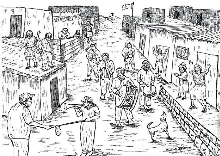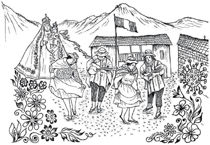 Finalmente, la danza y el canto, como generador de una posibilidad de imaginar la nación, las encontramos en otro dibujo y testimonio recogido por Jiménez. Nos referimos al titulado "Llaqtamaqta" (Jiménez, 2021, pp. 144-147). El llaqtamaqta es un tipo de huayno original de Chungui y antes del conflicto armado interno era utilizado sobre todo para hablar de temas amorosos. Un punto interesante que señala Jiménez, en una entrevista que le realizamos11, es que durante el conflicto armado el llaqtamaqta se convirtió casi en un himno de resistencia ya que era un canto que los chunguinos entonaban para alegrarse y para, a partir de ello, soportar la crudeza de la guerra que libraban. Asimismo, el autor nos señala que todos los testimonios de este libro fueron obtenidos originalmente en castellano, contando únicamente con dos excepciones: una de ellas es la del llaqtamaqta, pues Jiménez la escuchó en quechua, recibió la letra y la tradujo al castellano para el libro. Ahora bien, es sabido que luego del conflicto armado interno los temas sobre los que versó se ampliaron y consolidaron en temáticas sociales. Según La Rosa, Quispe y Ventura (2017) con este huayno: