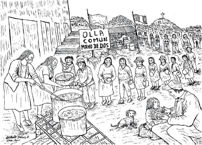 Un tercer dibujo que demuestra cómo la propuesta de Jiménez deja ver una reposición de ciudadanía y de justicia restaurativa es el que se titula "Ollas comunes" (Jiménez, 2021, pp. 98-99). Este dibujo y su testimonio son poderosos y altamente simbólicos. Observamos, nuevamente, un lugar de pobreza extrema: la bandera blanca junto a la bandera del Perú, piso de tierra, mujeres y hombres con ropa remendada, casas de material endeble con techos de calamina que escalan hasta el tope de los cerros. En este paraje encontramos tres ollas grandes apoyadas en madera y calentadas por las brasas. Detrás de estas ollas están dos mujeres y una niña cocinando y repartiendo una sopa. Frente a ellas hay una extensa cola de mujeres y hombres esperando con un plato para poder compartir de la generosidad dada por ellas. Al lado de la cola, un padre ha recibido una ración y se la da a su pequeña hija en la boca (Figura 7). Esta escena muestra un acceso igualitario a la comida en la que los más necesitados pueden pagar lo mínimo, centavos, como una forma simbólica de agradecer y de mantener en funcionamiento las ollas comunitarias. Así las cosas, aunque las ollas populares han existido en el Perú desde siempre, en la pandemia se han convertido en un pilar vital para las poblaciones más vulnerables de las barriadas, reafirmando con su sola existencia que si ninguna institución hizo algo efectivo para ayudarlas, serían ellas mismas los que se ayudarían. Ellas, sobre todo las madres que cocinan y que recaudan algo de dinero y piden donaciones en las calles, proponen otra forma de imaginar la comunidad. Un fragmento del testimonio de esta ilustración señala lo siguiente: