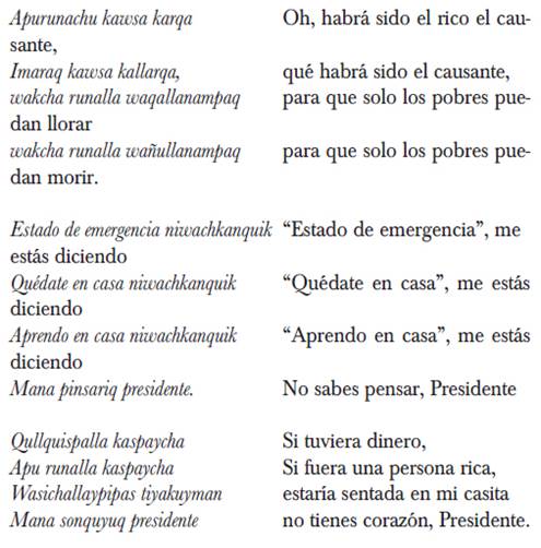 En el caso que nos ocupa, Jiménez retoma un llaqtamaqta que habla del coronavirus (2021, pp. 145146). Él viaja al pueblo de Chungui y encuentra que un grupo musical llamado Los Qantus había hecho una composición titulada "Virus unquy" (enfermedad del virus). Citamos algunas estrofas significativas: