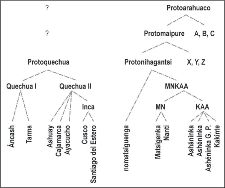 En la Figura 2, las variedades mencionadas en el cuerpo de este artículo ―y solo estas― aparecen en el contexto de la clasificación interna de cada familia. En el caso de la familia quechua, se recoge la propuesta de clasificación de Alfredo Torero Fernández de Córdova (1983, pp. 62-63, 78-85)5, pero incorporando algunas de las críticas de César Itier (2013, pp. 255-256; 2016, pp. 323-324); y en el caso de la familia nihagantsi, la propuesta de Lev Michael (2011, p. 7). La última aparece, además, con el grupo arahuaco como trasfondo (cfr. Payne, 1991, p. 365).