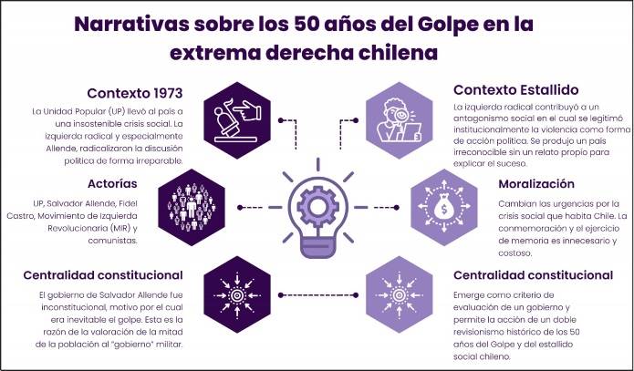 Consideramos que la coyuntura discursiva del estallido social y su cercanía con los 50 años del golpe de Estado permitió a las actorías de la extrema derecha hacer un doble revisionismo histórico. Uno, en términos de aniversario de un hecho de larga data y, otro, en términos narrativos en los cuales hicieron que ideas revisionistas sobre un "golpe de Estado" o "traición" o "insurrección" pasaran de lo anecdótico en el espacio digital a formar, paulatinamente, parte del discurso institucional, incluso en un expresidente.