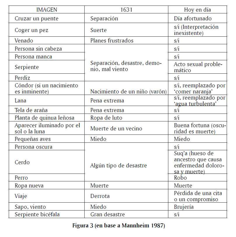 A primera impresión, no es sorprendente que el léxico de sueños haya cambiado tanto en 350 años, especialmente si se consideran los cambios cataclísmicos que sufrieron las comunidades quechuas en ese periodo. Sin embargo, contrastar esto con una notable persistencia cultural que etnógrafos e historiadores han registrado en material iconográfico (Cereceda 1978b; Gisbert 1981; Hocquenghem 1987; López Baralt 1987), ritual, patrones de estructura social como la organización en mitades (Cereceda 1978a, Flores 1972, 1976; Hopkins 1982; Zuidema 1970), calendarios y cosmología (Isbell 1978:197-220; Ossio, ed. 1973; Urton 1981; Zuidema 2011) y mitología (Custred 1978, Ortiz 1973, 1978; Zuidema y Quispe 1968). La persistencia de formas culturales andinas es lo suficientemente amplia para haber proveído una heurística con la cual pueden ser identificadas la variación y los cambios en formas y prácticas simbólicas. Comparada con la persistencia de otros sistemas semióticos andinos, la inestabilidad de las imágenes de sueños es anómala. Si los cambios fueran simplemente una cuestión de erosión a través de 350 años, deberíamos encontrar cambios de una escala similar en otros sistemas semióticos. Sin embargo, esto no es lo que los etnógrafos e historiadores andinistas han observado. Estamos enfrentados con el problema de explicar por qué el léxico de sueños ha cambiado mucho más rápidamenwte que otros sistemas semióticos. Más ampliamente la pregunta sería ¿por qué algunos sistemas semióticos son más estables que otros? Y ¿por qué el correspondiente a la interpretación de los sueños es tan inestable?