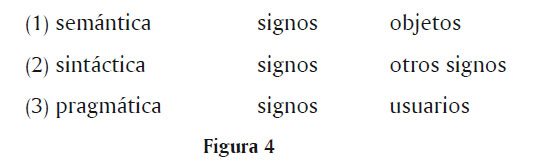 Para responder estas preguntas necesitamos discutir la organización semiótica de la interpretación de sueños, y mostrar como su organización semiótica es distinta a la dos de los sistemas más estables: la narrativa y el ritual. De acuerdo con Peirce (1931[1997]) y Morris (1938, secciones 3, 5, 7), los signos tienen significado por virtud a tres relaciones primarias: (1) Las relaciones semánticas de los signos con sus objetos, por medio de otros signos (sus interpretantes); (2) las relaciones sintácticas de los signos con otros signos con los que están combinados; (3) las relaciones pragmáticas de los signos con sus usuarios18 (ver Figura 4).