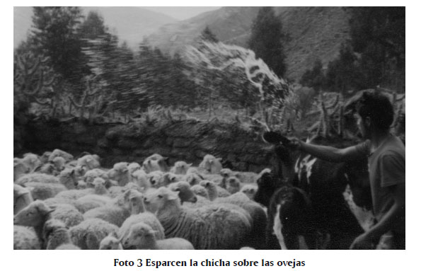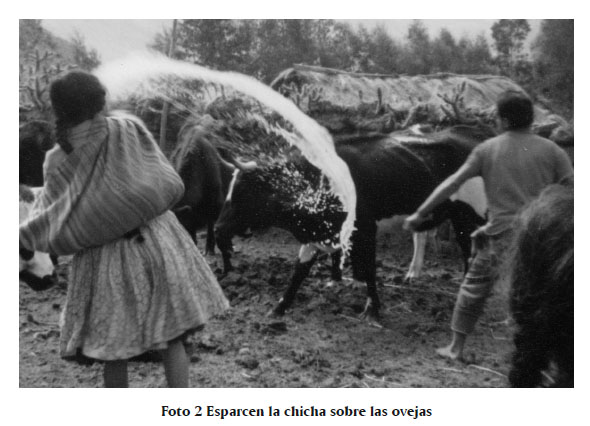 En pares de dos, un hombre y una mujer, llenan calabazas con una bebida hecha de maíz (a base de chicha de jora). Se arrodillan en el corral, el hombre a la izquierda y la mujer a la derecha, mirando hacia las ovejas. Toman un poco de tierra con la mano derecha y la besan. [Foto 1] (Como pueden imaginar la tierra de un corral se encuentra llena de estiércol.) Dejan cuidadosamente la tierra y levantan los mates también con la derecha. Se paran y esparcen la chicha sobre las ovejas. [Foto 2 y 3] Si una oveja se acerca hacia el jarro de chicha, se le fuerza a tomar licor. El mismo procedimiento se hace para las vacas. Esta vez las posiciones son invertidas, la mujer se ubica a la izquierda del hombre.