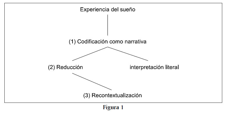 En cada interpretación, la experiencia del sueño es codificada en una forma narrativa: la narrativa ha sido reducida en una o algunas imágenes claves tomadas de un léxico convencional de imágenes de sueños. Estas imágenes claves son recontextualizadas tomando en cuenta su relevancia respecto a las circunstancias personales de quien soñó y ocasionalmente también considerando otras imágenes clave. Esto está diagramado en la Figura 1, a partir de Mannheim (1987: 147).