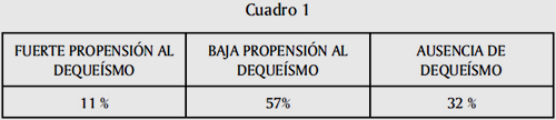 El 11% de los sujetos exhibe una fuerte propensión al dequeísmo sin llegar al nivel del dequeísmo masivo. Ello quiere decir que, en estos sujetos, un alto número de estructuras oracionales se adscribe al formato dequeísta. El 57% de los sujetos evidenció una baja propensión (menos de la mitad de estructuras gramaticales) y el 32% de los sujetos se comportó de acuerdo con el formato conservador de hablante no dequeísta.