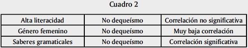 Entre los sujetos investigados que muestran ausencia de dequeísmo, no se ha encontrado una correlación significativa con la alta literacidad (es decir, intenso hábito de lectura). Asimismo, ha habido una bajísima correlación con el género femenino, lo que bien podría interpretarse como una refutación parcial de la hipótesis que propugna el conservadurismo lingüístico de las mujeres, como se señala en algunos estudios de sociolingüística interaccional (Blas Arroyo 2012). Sí se ha encontrado una correlación significativa entre el no dequeísmo y una variable que se puede definir como ‘saberes gramaticales’ (esto es, haber participado en varios cursos sobre gramática normativa de la lengua española). Así, se puede proponer una estratificación de hablantes no dequeístas en función de esa variable. Por ejemplo, los sujetos de nivel secundario se encuentran en el nivel más bajo de no dequeísmo y los sujetos del décimo ciclo de nivel universitario ostentan el nivel más alto de no dequeísmo.