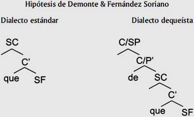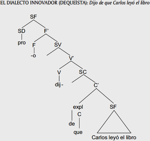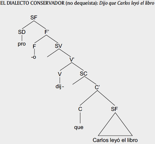 En el dialecto conservador, el sintagma complementante (SC) inserta un elemento subordinante ‘que’ (complementizador) que introduce la cláusula subordinada (Carlos leyó el libro). Para este grupo de hispanohablantes, basta con el nexo ‘que’ para que la derivación de la subordinación converja legítimamente. Para estos hablantes, la inserción de un elemento ‘de’ en esta estructura sintáctica es ilegítima y ello explicaría formalmente por qué consideran una oración dequeísta como inelegante.