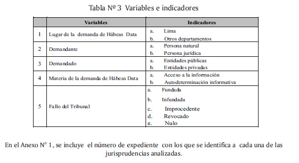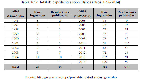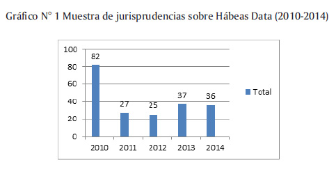 The research describes and analyses the level of protection of the right of access to information and protection of personal data or informational self-determination, through the jurisprudence of Habeas Data determined by the Constitutional Court of Peru during the last five years (2010-2014). It identifies the places of highest incidences of this type of guarantee, types of plaintiffs and defendants, the matter of demand and the type decisions issued by the Court that ended to the demands of Habeas Data.