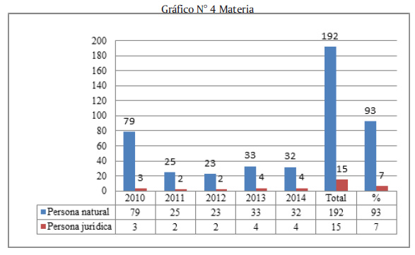 La materia en el ámbito judicial, es el derecho que se considera vulnerado y cuya protección o garantía se invoca a través de una demanda. En este caso, son dos derechos fundamentales, el acceso a la información y la autodeterminación informativa. Del análisis de las jurisprudencias, se ha determinado que casi la totalidad de las demandas están referidas al acceso a la información pública (92%) y solo un mínimo 8% a la autodeterminación informativa. Esto se explica, toda vez que la ciudadanía aún no está informada, o carece de suficientes elementos de juicio que lo lleven a solicitar protección a sus datos personales, o ejercer su derecho a la autodeterminación informativa.