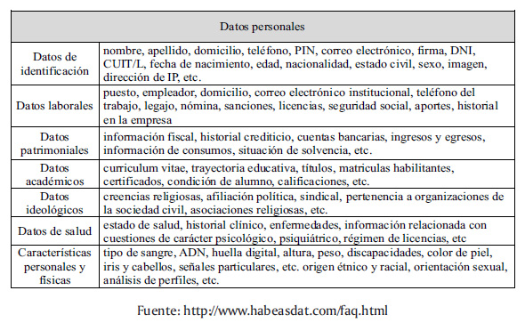 En la vida diaria y para un sinnúmero de actividades, se interactúa con diversas clases de registros de datos, las mismas que son registradas para un sinnúmero de finalidades. Chanamé (2003) cita a Falcón (1996), quien los tipifica: Registros personales. Registros comerciales. Registros impositivos. Registros de propiedad. Registros políticos. Registros sanitarios. Registros de información y de simple registración. Registros públicos, registros semipúblicos, registros privados, registros secretos. (pp. 127-128). Asimismo, la siguiente Tabla muestra una extensa tipología de datos personales que pueden ser objeto de registro, tanto por la administración pública y privada.