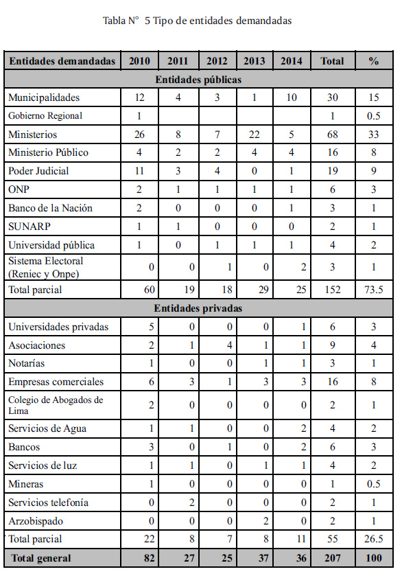 Lo conforman las personas naturales o jurídicas contra quienes se inicia un proceso judicial. Los datos que se adjunta en la siguiente Tabla, muestran que las entidades con mayor número de demandas fueron los organismos públicas; entre ellas, los ministerios (33%), seguido de las municipalidades (15%). Esto se explica, porque a nivel del Gobierno Central, es el Poder Ejecutivo quien aglutina a la mayoría de organismos descentralizados, y a nivel de Gobiernos Locales, son las municipalidades representadas por sus alcaldes, los que ejercen función pública. Y, sobre las demandas presentadas contra las entidades privadas, estos representan escasamente el 8%, lo cual muestra desconocimiento de la población de ejercer su derecho de acceso a la información o la autodeterminación informativa, también, contra entidades privadas que prestan servicios públicos.