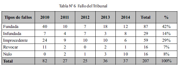 El fallo de un organismo autónomo como es el Tribunal Constitucional, comprende el contenido de las resoluciones que ponen fin al recurso de agravio constitucional, en este caso, de Hábeas Data. De todas las resoluciones analizadas, un poco menos de la mitad (42%) fueron declaradas fundadas, lo cual significa que los fallos se ajustan a ley y se les da la razón a los demandantes. Sin embargo, si se compara las cifras con lo resuelto el año 2010, la mayoría de las demandas fueron declaradas fundadas, hecho que se redujo en los años posteriores. Mientras tanto, las resoluciones declaradas infundadas solo alcanzaron el 14%. A su vez, casi la tercera parte (29%) de las demandas fueron consideradas improcedentes, significa esto que presentaban errores de fondo que debían ser subsanadas. De estos datos se infiere que, las diferentes decisiones adoptadas en los fallos del TC, denotan que el recurso de agravio de Hábeas Data, requiere ser mejor entendido por los abogados y operadores del derecho, para así acudir al máximo organismo con actuados procesales que se ajusten a ley y evitar que las demandas sean declaradas improcedentes, revocadas o nulas, afectando los derechos de la ciudadanía.
