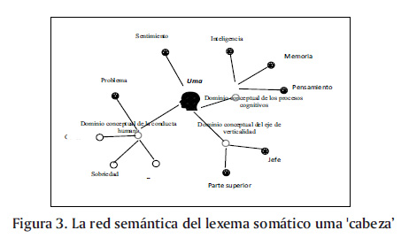 2. En el lexema somático uma 'cabeza' se han detectado diez significados periféricos, de los cuales nueve de ellos están constituidos en tres grupos. El primer grupo del eje de verticalidad reúne los sentidos de jefe y parte superior; el segundo grupo de los procesos cognitivos, los conceptos de memoria, pensamiento e inteligencia; y el tercer grupo de la conducta humana, los conceptos de ladrón, sobriedad, cordura y problema. Finalmente, es posible referir el concepto de sentimiento mediante el término uma.