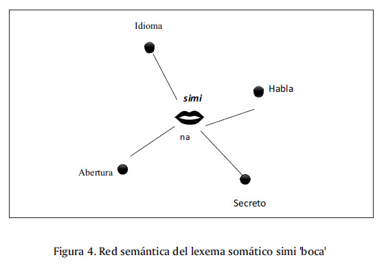 La red semántica de simi 'boca' expresa cuatro sentidos. Estos son los conceptos de idioma, habla, secreto, y abertura.