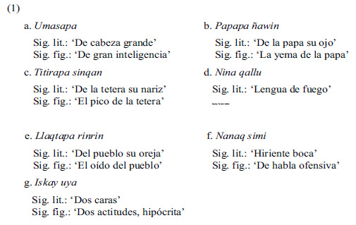 Los lexemas somáticos uma 'cabeza', ñawi 'ojo', sinqa 'nariz', qallu 'lengua', rinri 'oreja', simi 'boca' y uya 'cara' revelan conceptualizaciones diversas, tales como inteligencia (1a), yema (1b), pico (1c), habla (1d y 1f), oído (1e) y actitud (1g). Los lexemas somáticos presentes en la región topográfica del tronco manifiestan el mismo comportamiento: