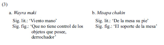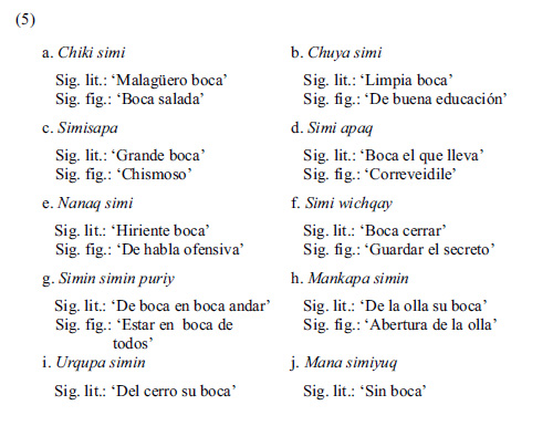 En estos casos, el lexema somático simi es utilizado para expresar el concepto de habla. Nótese, sin embargo, que mientras en (26) el concepto es reforzado por el ítem léxico chiki 'salado', en (27) dicho concepto es realzado por el verbo apay 'llevar'. De este modo, la facultad del habla del quechuahablante es caracterizada en una expresión como boca salada, mientras que en la otra, como el que lleva el habla. Esto último supone, asimismo, que el habla se conciba como un objeto, el cual es pasible de llevarse (o transportarse). El mismo sentido aparece, incluso, en otras construcciones: