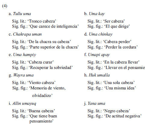 Como se ha visto, estas expresiones lingüísticas constituyen la puerta de entrada al sistema conceptual del nativohablante de quechua ayacuchano; sin embargo, de todos los somatismos presentados, uma 'cabeza' y simi 'boca' constituyen dos de los lexemas somáticos, como veremos en (4) y en (5), respectivamente, con mayor índice de expresiones que transgreden el lenguaje literal, y configuran un complejo abanico de posibles conceptos: