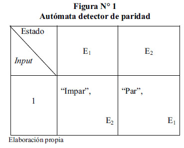 Ilustremos estas ideas mostrando la tabla de máquina de un autómata detector de paridad dada por Block (1996). Este autómata cuenta con dos estados, E1 y E2, un input, '1,' y dos outputs, emitir la expresión 'par' y emitir la expresión 'impar.' Esto quiere decir que el autómata puede indicarnos si percibe un número par o impar de cifras 1. La tabla de máquina que expresa la organización funcional del autómata es la siguiente: